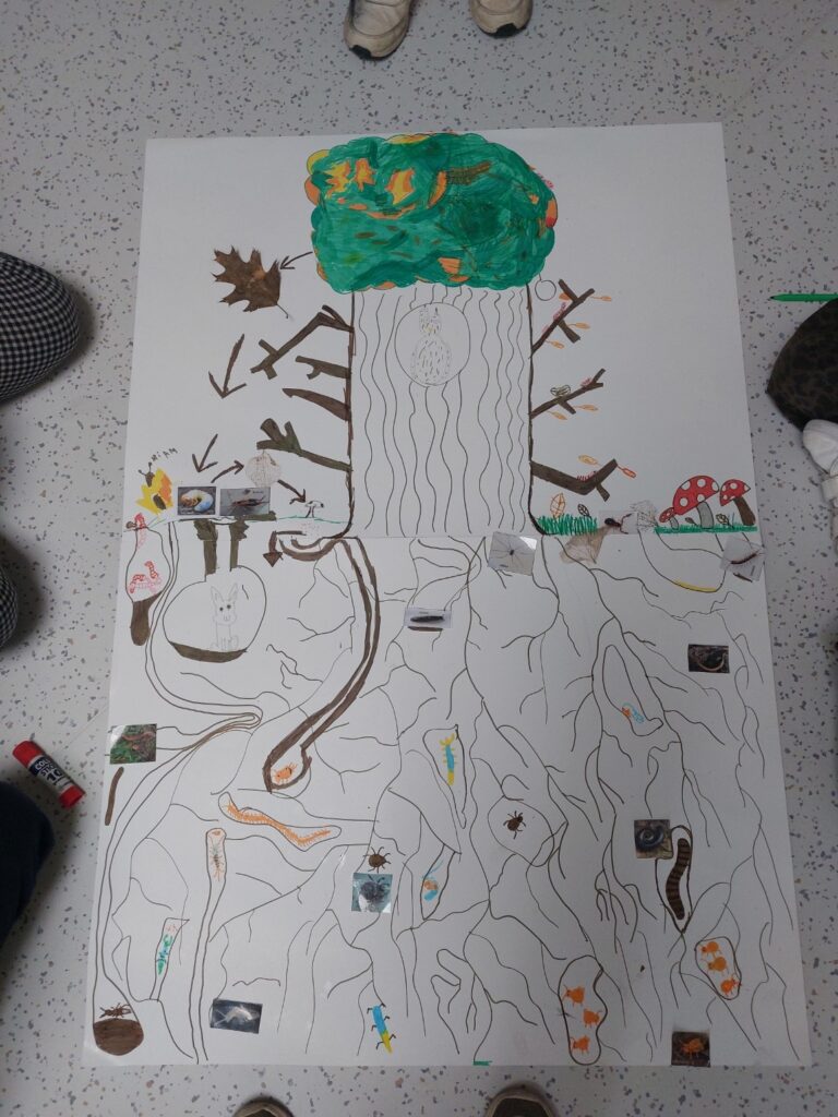 Les 20 enfants présents ont tellement été enthousiastes pour réaliser le poster que le temps a manqué aux deux groupes pour indiquer par des flèches le trajet de la matière sur leur poster pour boucler le cycle du devenir d’une feuille tombée de l’arbre.